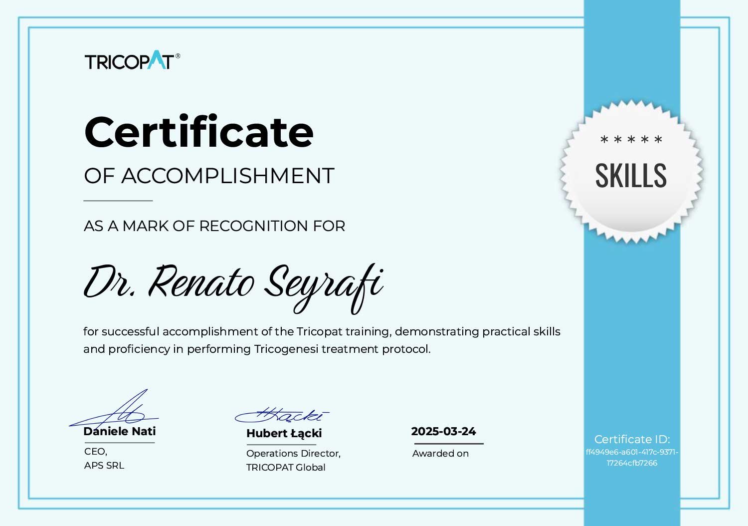 Diese Zertifkate dokumentieren meine umfangreiche Fachausbildung und jahrelange Erfahrung auf dem Gebiet der Haarmedizin. Mit diesen Qualifikationen stehe ich Ihnen als kompetenter Ansprechpartner zur Verfügung, um Ihnen die bestmögliche Behandlung zu bieten.